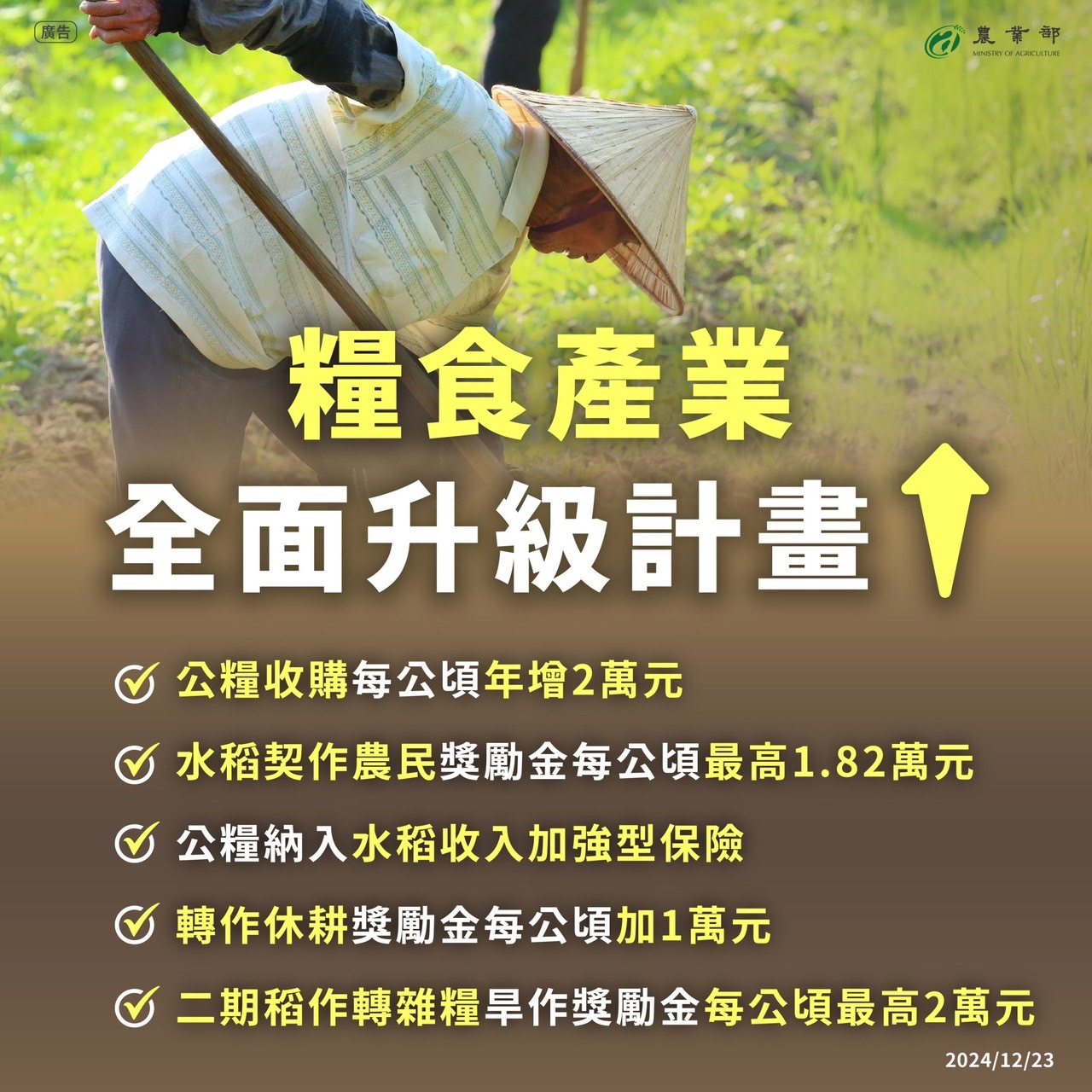 因此,農業部考量 適時反映生產成本、兼顧糧食產業均衡發展、強化農民收益韌性 三大原則,提出 糧食產業全面升級計畫!